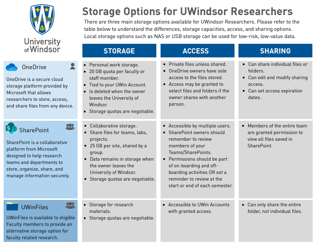 University of Windsor's institutional OneDrive access is hosted locally on institutional servers and is a viable option for secure active storage. Space available to faculty is 20GB of space.